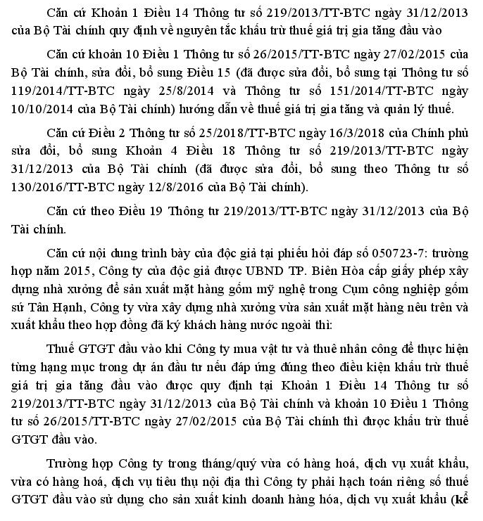 Kính gửi Bộ Tài Chính, Tôi có câu hỏi liên quan đến chính sách thuế mong quý Bộ giải đáp thắc mắc như sau: Ngành nghề kinh doanh Cty tôi là : Sản xuất mặt hàng gốm mỹ nghệ. Cty hoạt động kinh doanh chính là sản xuất mặt hàng gốm mỹ nghệ như bình gốm, chậu hoa....xuất khẩu chính ngạch thị trường Mỹ, Anh, Úc, Canada, Singapore... Năm 2015 Công ty được UBND TP. Biên Hòa cấp phép xây dựng nhà xưởng để sản xuất mặt hàng gốm mỹ nghệ trong Cụm công nghiệp gốm sứ Tân Hạnh. Do bị hạn chế về mặt tài chính, đơn vị không thuê nhà thầu bao trọn gói dự án xây nhà xưởng này mà tự tìm nguồn vật tư và nhân công để thực hiện từng hạng mục trong dự án để giảm thiểu chi phí. Vừa xây dựng nhà xưởng vừa sản xuất mặt hàng gốm mỹ nghệ để xuất khẩu theo hợp đồng đã ký với khách hàng nước ngoài, đơn vị thực hiện xây dựng theo dạng cuốn chiếu và hoàn thành đến đâu là đưa vào sử dụng ngay. Thuế GTGT đầu vào hình thành nên tài sản cố định tự làm Công ty kê khai và khấu trừ thuế hàng tháng khi phát sinh nghiệp vụ kinh tế. Căn cứ Thông tư số 219/2013/TT-BTC ngày 31/12/2013 của Bộ trưởng Bộ Tài chính hướng dẫn về thuế GTGT: - Tại Khoản 1 Điều 14 nguyên tắc khấu trừ thuế giá trị gia tăng đầu vào: “1. Thuế GTGT đầu vào của hàng hóa, dịch vụ dùng cho sản xuất, kinh doanh hàng hóa, dịch vụ chịu thuế GTGT được khấu trừ toàn bộ, kể cả thuế GTGT đầu vào không được bồi thường của hàng hóa chịu thuế GTGT bị tổn thất. - Tại Khoản 4 Điều 7 quy định giá tính thuế đối với sản phẩm, hàng hóa, dịch vụ tiêu dùng nội bộ. Trường hợp cơ sở kinh doanh tự sản xuất, xây dựng tài sản cố định (tài sản cố định tự làm) để phục vụ sản xuất, kinh doanh hàng hóa, dịch vụ chịu thuế GTGT thì khi hoàn thành, nghiệm thu, bàn giao, cơ sở kinh doanh không phải lập hóa đơn. Thuế GTGT đầu vào hình thành nên tài sản cố định tự làm được kê khai, khấu trừ theo quy định. Công ty vướng mắc kính mong Bộ Tài Chính giải đáp trường hợp thuế giá trị gia tăng đầu vào hình thành nên tài sản cố định tự xây dựng nhà xưởng có hóa đơn giá trị gia tăng hợp pháp và có chứng từ thanh toán tiền theo quy định thì Công ty có được kê khai khấu trừ và hoàn thuế khi phát sinh chi phí mua vào hay không ? Kính mong Bộ Tài Chính hỗ trợ giải đáp để Công ty biết và thực hiện đúng quy định. Trân trọng kính chào.