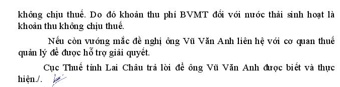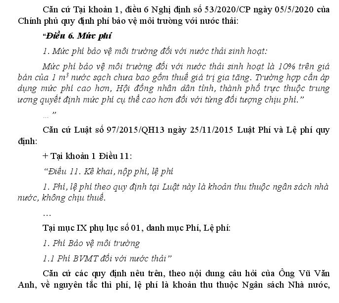 Kính gửi: Tổng cục Thuế. Căn cứ Nghị định số 53/2020/NĐ-CP ngày 05/05/2020 Quy định về phí môi trường đối với nước thải. Tại khoản 1, Điều 6 '' Mức phí bảo vệ môi trường đối với nước thải sinh hoạt là 10% trên giá bán của 1 m3 nước sạch chưa bao gồm thuế giá trị gia tăng' . Vậy phí nước thải có phải chịu thuế GTGT không. VD Gia đình tôi dùng hết 100m3 x 10.000đ/m3 = 1.000.000đ; phí nước thải = 1.000.000đ x10% =100.000đ. Vậy 100.000 gia đình tôi có phải chịu thuế GTGT không (100.000x10%GTGT=10.000đ). Xin cảm ơn