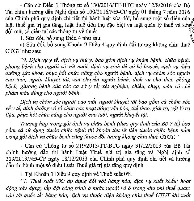 Kính gửi Bộ Tài Chính. Công ty chúng tôi là công ty thực hiện dịch vụ khám- chữa bệnh (mảng lĩnh vực y tế) thành lập năm 2021 do sở kế hoạch đầu tư cấp phép, trụ sở đặt tại Quận Hà Đông- hà Nội. Hiện tại, công ty chúng tôi cung cấp dịch vụ khám bệnh cho các công ty thuộc các lĩnh vực khác nhau trong đó có công ty khu chế xuất. Theo luật thuế, Lĩnh vực y tế (cụ thể khám chữa bệnh) là lĩnh vực áp dụng không chịu thuế GTGT. Tuy nhiên, có công ty bên khu chế xuất mà chúng tôi thực hiện có yêu cầu chúng tôi xuất hóa đơn 0%. Vậy xin hỏi bộ tài chính chúng tôi xuất hóa đơn 0% có đúng không?. Chúng tôi đã hỏi công văn lên chi cục thuế quận Hà Đông được hướng dẫn vẫn thực hiện đúng theo luật hướng dẫn với lĩnh vực hoạt động y tế là "Không chịu thuế". Bên khách hàng có hỏi Cục thuế Hưng Yên và yêu cầu công ty chúng tôi xuất 0% và có trả lời hiện chi cục Hưng Yên đang to hơn chi cục thuế quận nên áp dụng với đơn vị có thẩm quyền cao hơn. Kính mong quý Bộ quan tâm hướng dẫn để công ty chúng tôi thực hành, chấp hành đúng luật. Trân trọng cảm ơn!.