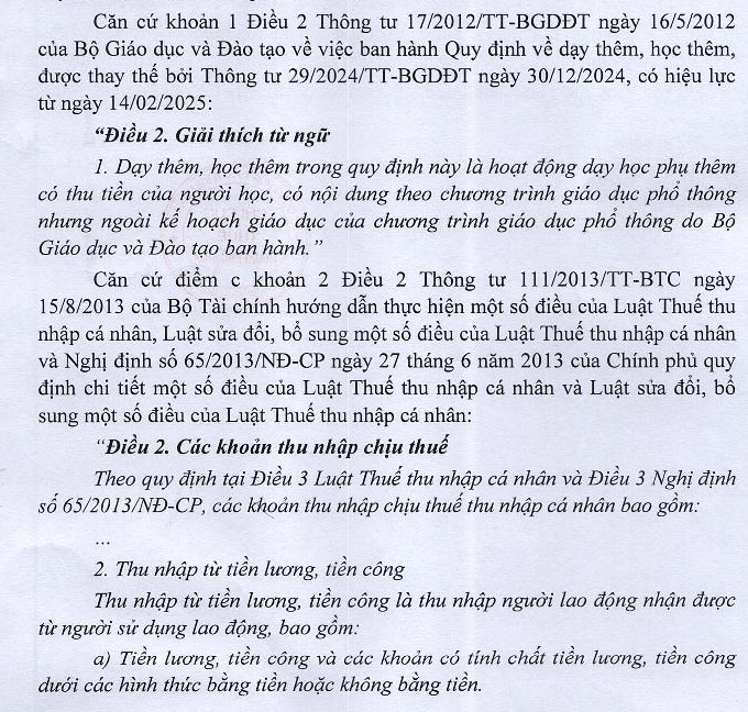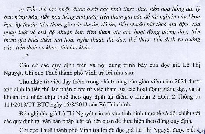 Tôi xin hỏi về tính thuế thu nhập cá nhân: Giáo viên có dạy thêm trong nhà trường: Ví dụ là 1 giáo dạy trong năm là 30 buổi dạy ( Mỗi buổi gồm 3 tiết, mỗi tiết 45 phút ) mối buổi dạy thêm được trả 700.000 đồng nguồn tiền thu từ phụ huynh đê trả tiền dạy thêm cho cô tiền dạy thêm năm 2024 là 30 buổi x 700.000đồng =: 35.000.000 đồng cửa năm 2024 . Vậy tính thu nhập chịu thuế của năm 2024 là cả số tiền 35.000.000 đồng hay sao ? Mong được phản hồi sớm nhất đê làm sớm nhất. Xin cảm ơn