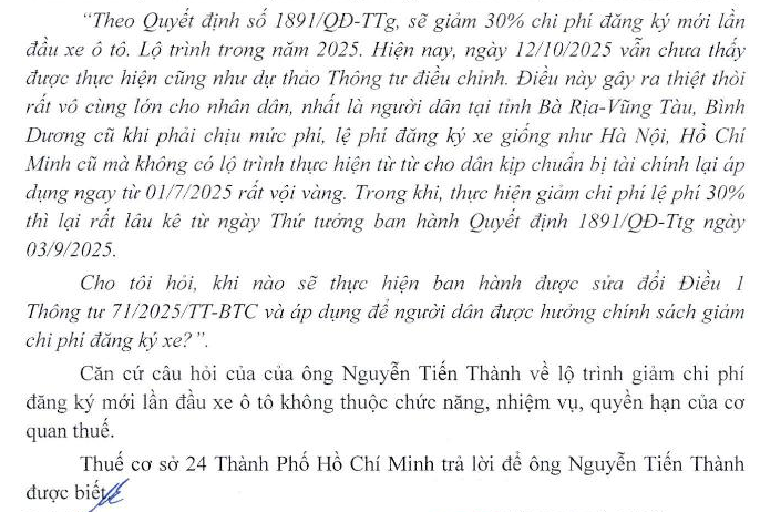 Theo Quyết định số 1891/QĐ-TTg, sẽ giảm 30% chi phí đăng ký mới lần đầu xe ô tô. Lộ trình trong năm 2025. Hiện nay, ngày 12/10/2025 vẫn chưa thấy được thực hiện cũng như dự thảo Thông tư điều chỉnh. Điều này gây ra thiệt thòi rất vô cùng lớn cho nhân dân, nhất là người dân tại tỉnh Bà Rịa-Vũng Tàu, Bình Dương cũ khi phải chịu mức phí, lệ phí đăng ký xe giống như Hà Nội, Hồ Chí Minh cũ mà không có lộ trình thực hiện từ từ cho dân kịp chuẩn bị tài chính lại áp dụng ngay từ 01/7/2025 rất vội vàng. Trong khi, thực hiện giảm chi phí lệ phí 30% thì lại rất lâu kể từ ngày Thủ tướng ban hành Quyết định 1891/QĐ-Ttg ngày 03/9/2025.