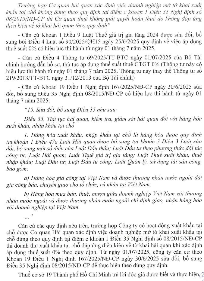Kính gởi Bộ tài chính, Chúng tôi là doanh nghiệp FDI kinh doanh hàng phụ liệu may mặc hơn 15 năm tại Tp.Hồ Chí Minh, Đơn hàng của chúng tôi đa số do Thương nhân nước ngoài đặt hàng và chỉ định giao hàng cho nhà máy gia công của họ tại Việt Nam, nên chúng tôi đã làm tờ khai xuất khẩu tại chỗ loại hình B11 cho các đơn hàng này với thuế suất 0%, Và từ đầu năm 2023 chúng tôi bị vướng phải tình trạng không thể hoàn thuế GTGT cho tờ khai xuất khẩu tại chỗ do không xác minh được các Thương nhân đối tác nước ngoài này có hiện diện hay không hiện diện tại Việt Nam căn cứ theo điểm c khoản 1 điều 35 Nghị định 08/2015/NĐ-CP ngày 21/01/2015, do đó chúng tôi đã ngưng hồ sơ hoàn thuế GTGT đến nay chờ hướng dẫn; Đến Ngày 30 tháng 06 năm 2025, Chính phủ đã ban hành Nghị định 167/2025/NĐ-CP sửa đổi, bổ sung điểm c khoản 1 điều 35 Nghị định 08/2015/NĐ-CP trong đó có quy định chi tiết chính sách xuất nhập khẩu tại chỗ là đã Bỏ điều kiện không có hiện diện tại Việt Nam đối với Thương nhân nước ngoài, Nhưng đến tháng 9/2025, chúng tôi liên hệ nộp hồ sơ hoàn thuế GTGT cho Thuế khu vực quản lý đồng thời công văn gởi đến Cục Thuế thành phố Hồ Chí Minh thì nhận được công văn trả lời số 3999/TPHCM-NVDTPC ngày 24/10/2025 rằng họ căn cứ Công văn 558/BTC-CS ngày 20/2/2024 về chính sách thuế GTGT đối với hàng xuất nhập khẩu tại chỗ: Thương nhân nước ngoài hiện diện tại Việt Nam không thuộc trường hợp xuất nhập khẩu tại chỗ quy định điểm c khoản 1 điều 35 Nghị định 08/2015/NĐ-CP cũng như hồ sơ hoàn thuế GTGT của chúng tôi sẽ bị tạm loại trừ doanh thu đối với hàng xuất khẩu tại chỗ; Vậy chúng tôi kính mong nhận được Bộ Tài Chính phân tích trường hợp kinh doanh của chúng tôi phải áp dụng theo Nghị định/Thông tư nào ? có được xem là xuất khẩu tại chỗ không? và có được hoàn thuế GTGT tiếp tục cho các đơn hàng hiện tại và trong tương lai hay không?