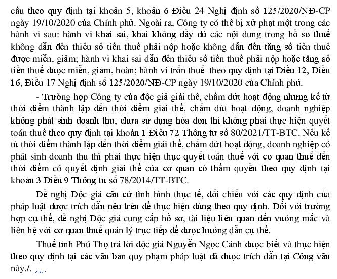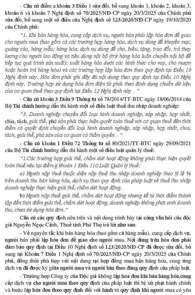 Em tôi có thành lập doanh nghiệp công ty TNHH 1 thành viên vào năm 2024. Do kê hoạch kinh doanh bị gián đoạn không triển khai được nên phải làm thủ tục giải thể doanh nghiệp vào 6/2025. Công ty không phát sinh hóa đơn đầu vào, không phát sinh hóa đơn đầu ra trong suốt quá trình từ khi thành lập. chế độ báo cáo thuế và báo cáo kế toán thực hiện đầy đủ. Duy chỉ có 1 việc tại thời điểm mới thành lập có thực hiện giáo thử mẫu cho khách hàng qua sán điện tử để nhận phản hồi đánh giá và thu tiền tổng là hơn 300 ngàn đồng cho 3 lần giao khác nhau. Cán bộ thuế đang yêu cầu phải đăng ký sử dụng hóa đơn điện tử để xuất hóa đơn bán hàng với giá trị như trên thì mới hoàn tất việc đóng mã số thuế. Tôi xin hỏi giải pháp như vậy có quá phức tạp cho doanh nghiệp không? liệu có giải pháp nào khả quan hơn để doanh nghiệp thực hiện giải thể doanh nghiệp một cách thông thoáng theo quy định của luật pháp luật, theo phương châm đồng hành và kiến tạo của ngành thuế?