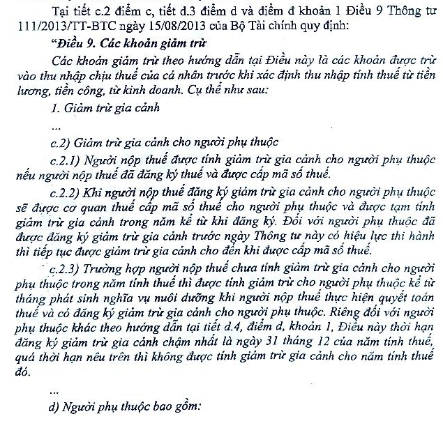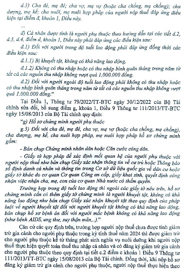 kính gửi Bộ tài chính, tôi có thắc mắc về NPT và số tháng tính phụ thuộc khi làm quyết toán thuế như sau.Tôi có đăng ký 2 NPT là bố và mẹ từ năm 2022 ở công ty A. Đến tháng 5 năm 2024 tôi có thay đổi nơi làm việc,ở một số công ty tôi làm chưa hết thời gian thử việc nên không được đóng bảo hiểm xã hội và tính giảm trừ gia cảnh khi nhận thu nhập( đã trừ 10% thuế). ở công ty có ký hợp đồng lao động chính thức tôi chưa khai báo lại NPT ở công ty mới nên khi trả thù nhập công ty không tính giảm trừ gia cảnh cho tôi. Tháng 4/2025 tôi làm hoàn thuế thu nhập cá nhân nhưng trên tờ khai gọi ý trên etax hiển thị tôi chỉ có1NPT và số tháng phụ thuộc là 5. tôi đã cập nhật lại là 2NPT và số tháng phụ thuộc là 12 theo khoản c2.3 điều 12 Nghị định 65/2013/NĐ-CP.Tuy nhiên cơ quan thuế lại từ chối hồ sơ của tôi với lý do số NPT và số Tháng được tính phụ thuộc không khớp với cơ quan thuế. Vậy cho tôi hỏi tại số tôi đã đăng2 NPT và năm 2022,2023 đều được tính là 2 người nhưng năm 2024 lại chỉ được tính 1 người( trên hệ thông etax vẫn hiển thị tôi có 2 NPT) và số tháng tính giảm trừNPT thực tế tôi được nhận là 5 tháng hay 12 tháng.
