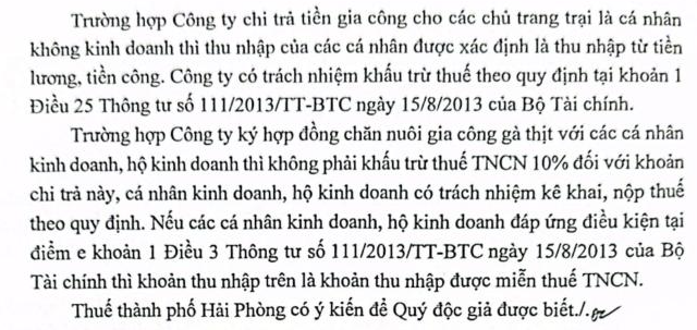 Kính gửi: Bộ tài chính Công ty chúng tôi hiện đang có thêm mảng trại( cụ thể là nuôi gà thịt) theo hình thức nuôi gia công cụ thể như sau: Công ty chúng tôi ký hợp đồng gia công với các chủ trại là cá nhân tại các địa điểm khác nhau để nuôi gia công theo hình thưc: Công ty cung cấp con giống, vắc xin, cám nuôi trong cả quá trình đến khi ra thương phẩm là gà thịt.... Hình thức trả: dựa vào lượng thương phẩm thu được để chi trả tiền gia công theo từng đợt. Vậy phần chi phí gia công khi thanh toán cho các chủ trại Công ty chúng tôi có trích lại 10% tiền thuế thu nhập cá nhân rồi mới chi trả khoản chi phí tiền gia công cho chủ trại đó không?