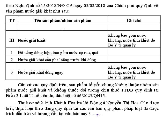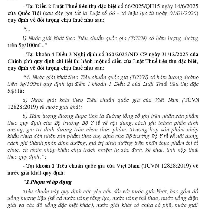Căn cứ Luật Thuế Tiêu thụ đặc biệt số 66/2025/QH15 ban hành ngày 14/6/2025, có hiệu lực từ 01/01/2026, quy định bổ sung nước giải khát theo TCVN 12828:2019 có hàm lượng đường trên 5g/100ml thuộc đối tượng chịu thuế tiêu thụ đặc biệt. Tiêu chuẩn này quy định các yêu cầu đối với nước giải khát, bao gồm đồ uống hương liệu (kể cả nước uống tăng lực, nước uống thể thao, nước uống điện giải và các đồ uống đặc biệt khác), nước giải khát có chứa cà phê, nước giải khát có chứa chè, đồ uống thảo mộc, nước giải khát có chứa nước trái cây và các loại đồ uống từ ngũ cốc). Tiêu chuẩn này không áp dụng cho các sản phẩm sau: - Sữa và sản phẩm từ sữa; - Thực phẩm dạng lỏng dùng với mục đích dinh dưỡng; - Nước khoáng thiên nhiên và nước uống đóng chai; - Nước rau, quả và nectar rau, quả; - Sản phẩm từ cacao. Hiện nay, đơn vị chúng tôi sản xuất các tổ loại yến chưng đựng trong hũ 70ml như: Tổ yến chưng đường phèn, tổ yến chưng đông trùng hạ thảo, tổ yến chưng hạt sen, tổ yến chưng táo đỏ, tổ yến chưng sụn vây cá, tổ yến chưng collagen… thành phần chính là yến tươi (6 gam/8 gam /10 gam). Với hàm lượng đường 8.21g/100ml. Như vậy sản phẩm tổ yến chưng của đơn vị sản xuất có được xem là “nước giải khát theo TCVN có đường >5g/100ml” và có thuộc đối tượng chịu thuế Tiêu thụ đặc biệt theo Luật 66/2025/QH15 hay không?