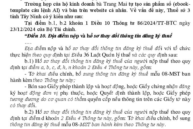 Xin chào, Tôi là cá nhân kinh doanh. Hình thức: tự tạo sản phẩm số để bán trên website cá nhân. Ngày 1.7.2025 tôi có đăng kí tờ khai cá nhân kinh doanh sách (tôi cung cấp ebook). Hiện tại tôi thay đổi sản phẩm kinh doanh là template câu lệnh AI - bán trên website cá nhân. Trong trường hợp này, tôi có các câu hỏi sau rất mong được giải đáp: 1. Làm cách nào để tôi đổi tờ khai kinh doanh của mình? Tôi chưa rõ thao tác cách làm. 2. Vì sản phẩm của tôi là sản phẩm số, tôi tự tạo - tự bán, không phải dịch vụ riêng cho bất kì cá nhân nào. Nên tôi không rõ mình cần kê khai vào hạng mục đóng thuế nào sau đây: A. Cung cấp hàng hóa B. Cung cấp dịch vụ C. Hoạt động kinh doanh khác 3. Hiện tại tôi đang đóng thuế theo hình thức: đóng thuế cho mỗi lần có phát sinh. Tức là mức thuế hiện tại chỉ rơi vào khoảng 1.5 - 7% / lần đóng thuế. Trong tương lai, nếu tổng thu nhập của tôi trên 500.000.000đ thì làm sao để tôi biết hoặc tôi cần làm gì để đóng phần thuế 10% theo quy định hiện hành? Xin cảm ơn.
