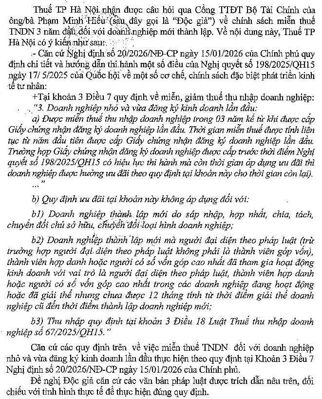 Theo khoản 3 Điều 7 Nghị định 20/2026/NĐ-CP, doanh nghiệp nhỏ và vừa đăng ký kinh doanh lần đầu được miễn thuế TNDN trong 03 năm kể từ khi được cấp Giấy chứng nhận đăng ký doanh nghiệp lần đầu. Tôi đã từng là Chủ sở hữu và đại diện Công ty TNHH một thành viên năm 2023 và đã chuyển nhượng toàn bộ vốn góp sang người khác vào tháng 04/2024. Hiện tại, tôi không là thành viên hợp danh hoặc người có số vốn góp cao nhất trong bất kỳ doanh nghiệp đang hoạt động nào. Vậy, nếu hiện tại tôi thành lập mới doanh nghiệp nhỏ thì có được miễn thuế TNDN 3 năm đầu không? Trân trọng cảm ơn!