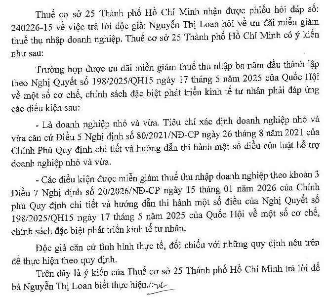 Kính gửi : Bộ Tài Chính Căn cứ theo nghị quyết 198/2025/QH15 ngày 17/05/2025 và nghị định hướng dẫn số 20/2026/NĐ-CP ngày 15/01/2026, thì doanh nghiệp nhỏ và vừa được miễn thuế thu nhập doanh nghiệp trong 3 năm kể từ khi được cấp Giấy chứng nhận đăng ký doanh nghiệp lần đầu, nhưng không áp dụng với doanh nghiệp thành lập mới mà người đại diện theo pháp luật, thành viên hợp doanh hoặc người có số vốn góp cao nhất đã tham gia hoạt động kinh doanh với vai trò là người đại diện theo pháp luật, thành viên hợp danh hoặc người có số vốn góp cao nhất trong các doanh nghiệp đang hoạt động hoặc đã giải thể nhưng chưa được 12 tháng tính từ thời điểm giải thể đến thời điểm thành lập doanh nghiệp mới. Vậy kính mong Bộ tài chính giải đáp giúp tôi là doanh nghiệp tôi mới thành lập tháng 04/2025, trong đó có 2 thành viên có số vốn cao nhất và bằng nhau (mỗi thành viên chiếm 30% vốn), nhưng 1 thành viên là đại diện pháp luật của doanh nghiệp khác thì doanh nghiệp chúng tôi có được hưởng ưu đãi miễn giảm thuế thu nhập doanh nghiệp theo nghị định 19/2025/QH15 hay không. Kính mong bộ xem xét và phản hồi để công ty chúng tôi thực hiện đúng quy định của nghị quyết. Trân trọng cám ơn!