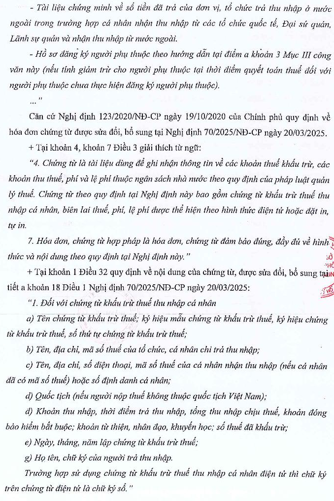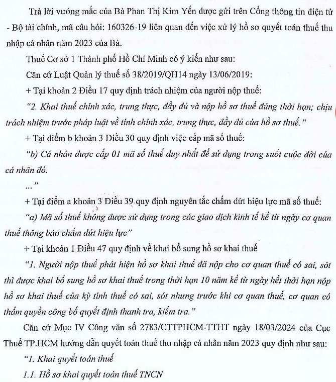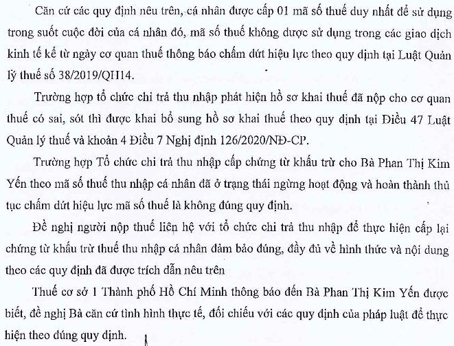 Kính gửi Bộ Tài chính, Tôi xin được hỏi như sau: Tôi có 2 mã số thuế: 1 mã số thuế theo CMND và 1 mã số thuế theo CCCD - Năm 2023: tôi đăng ký cho công ty mã số thuế theo CMND, tôi đã nhận chứng từ quyết toán thuế TNCN theo mã số thuế CMND, tôi chưa tạo tờ khai quyết toán thuế TNCN 2023. - Năm 2024: tôi đã huỷ mã số thuế theo CMND - Năm 2025: tôi tạo tờ khai quyết toán thuế TNCN năm 2023, ở tài khoản mã số thuế theo CCCD. Sau đó, tôi nhận thông tin từ chi cục thuế báo MST tài khoản và MST trên chứng từ không đồng nhất => không hoàn thuế. Cần điều chỉnh MST trên chứng từ đồng nhất với MST tài khoản kê khai thì tôi mới được chấp nhận hoàn thuế. - Tôi đã liên hệ công ty xin lại nhưng được thông báo không hỗ trợ xuất chứng từ theo MST hiện tại, do đã xuất theo MST CMND trước đó. ==> Trường hợp này, tôi cần xử lý như thế nào để được hoàn thuế? Kính mong cán bộ xem xét và hỗ trợ giải đáp để tôi kịp thời thực hiện theo đúng luật. Trân trọng cảm ơn!
